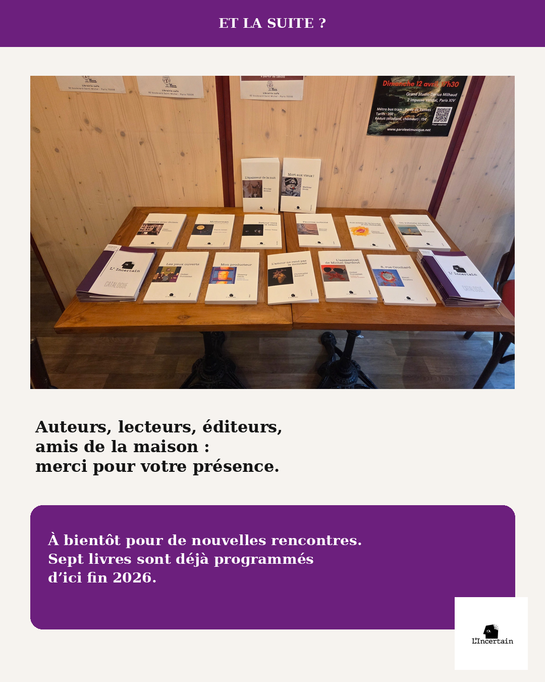 A bientôt pour de nouvelles rencontres. Sept livres sont déjà programmés d’ici fin 2026 !